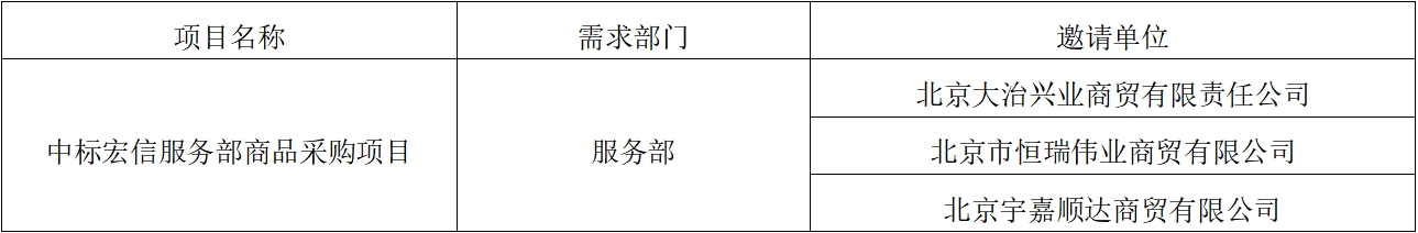 按照《中標宏信(北京)會議服務有限公司采購工作管理辦法(試行)》要求,現(xiàn)對中標宏信服務部商品采購項目競爭性談判邀請單位進行公式。